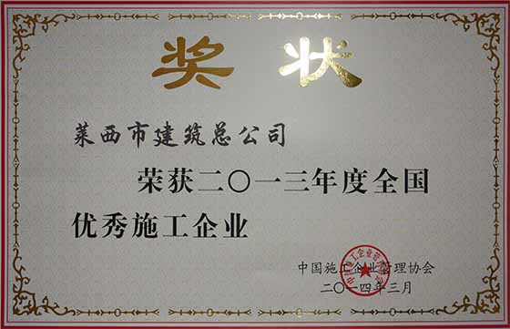 2014年4月17日至19日,中國施工企業(yè)管理協(xié)會在江蘇南京召開第29次年會,會上通報(bào)表彰了榮獲2013年度“全國優(yōu)秀施工企業(yè)”、“全國工程建設(shè)優(yōu)秀項(xiàng)目經(jīng)理”的先進(jìn)單位和個人,我公司再次再次獲得“全國優(yōu)秀施工企業(yè)”榮譽(yù)稱號,一公司董建明總經(jīng)理被評為“全國工程建設(shè)優(yōu)秀項(xiàng)目經(jīng)理”。