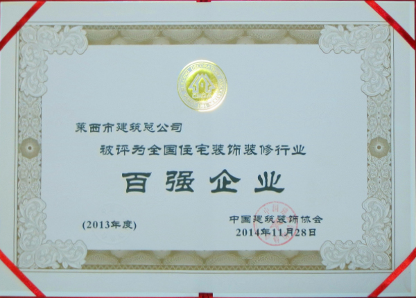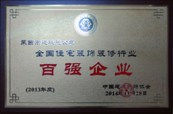 我公司被評為2013年度全國住宅裝飾裝修行業(yè)百強(qiáng)企業(yè)
