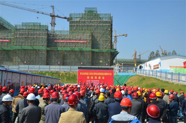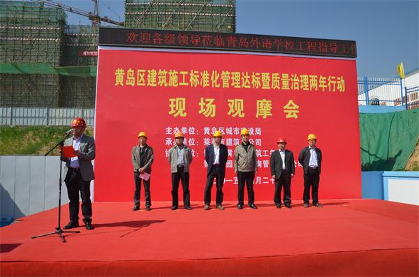 2015年4月22日上午,黃島區(qū)建筑施工標(biāo)準(zhǔn)化管理達(dá)標(biāo)暨質(zhì)量治理兩年行動(dòng)現(xiàn)場觀摩會(huì)在我公司孫有建項(xiàng)目部、顏坤項(xiàng)目部所施工的青島外語學(xué)校工程召開。青島市建管局總工程師孫憲閣,黃島區(qū)建管辦主任張偉,區(qū)質(zhì)監(jiān)站副站長李占勇,區(qū)建筑工務(wù)局副局長王城明,青島高園建設(shè)咨詢管理有限公司總經(jīng)理戚林立,我公司總經(jīng)理趙成福出席了本次觀摩會(huì)。