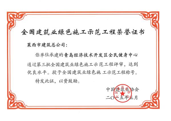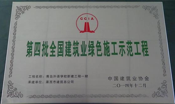 2015年5月13日,全國建筑業(yè)綠色施工經(jīng)驗交流會暨2014年度全國建設(shè)單位及工程項目節(jié)能減排達標競賽活動表彰大會、第四批全國建筑業(yè)綠色施工示范工程授牌大會在北京召開。我公司施工的全民健身中心工程通過全國第三批全國建筑業(yè)綠色施工示范工程評審,被授予“全國建筑業(yè)綠色施工示范工程”稱號;青島外語學校新建工程一期、德國企業(yè)中心項目、青島萬科廣場工程、凱豐國際廣場—城市微客廳、漢峪金融商務(wù)中心A7地塊一標段等五項工程榮獲第四批“全國建筑業(yè)綠色施工示范工程”。