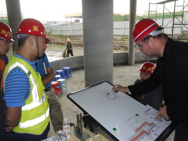 2015年9月2日,被動房施工培訓(xùn)活動在中德生態(tài)園項目舉辦。該活動由德國專家瓦倫廷先生(德國設(shè)計團隊ROA負(fù)責(zé)人)對被動屋施工技術(shù)進行現(xiàn)場授課。我公司及相關(guān)參建單位參加了此次培訓(xùn)。