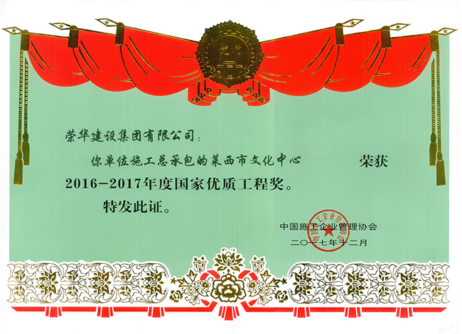 大會對獲得2016-2017年度國家優(yōu)質工程獎、2016年度中國施工企業(yè)管理協(xié)會科學技術獎的獲獎企業(yè)和先進個人進行了表彰。由我集團公司承建的萊西市文化中心工程榮獲“國家優(yōu)質工程獎”。七公司總經理吳克祥同志代表集團公司參加會議并上臺領獎。
