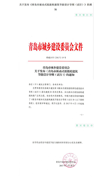 由我集團(tuán)公司參與編制的全國首個(gè)被動(dòng)房地方標(biāo)準(zhǔn)《青島市被動(dòng)房低能耗建筑節(jié)能設(shè)計(jì)導(dǎo)則》正式頒布實(shí)施。