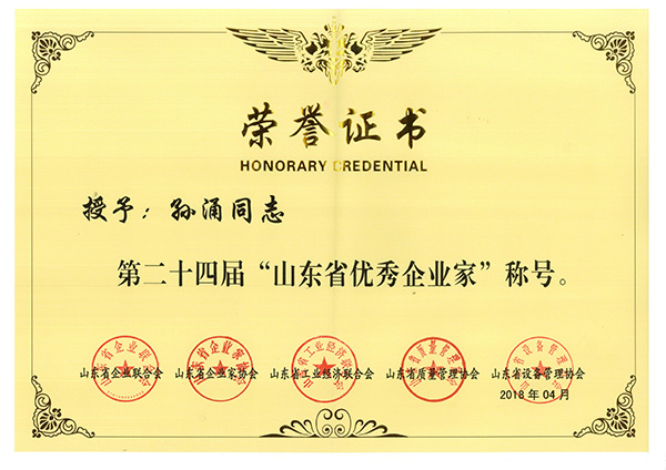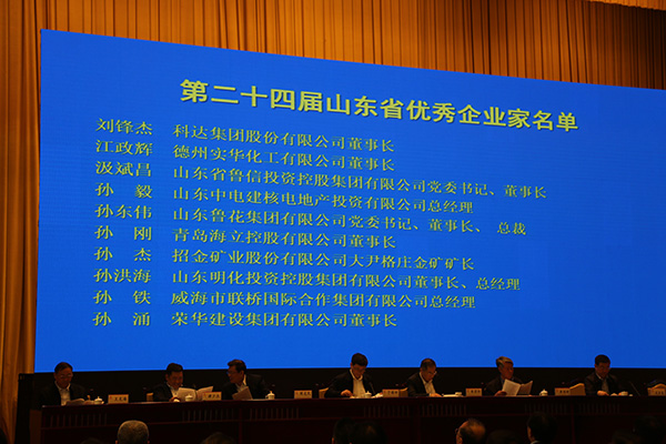 中國(guó)企業(yè)聯(lián)合會(huì)常務(wù)副會(huì)長(zhǎng)兼理事長(zhǎng)朱宏任、山東省企業(yè)聯(lián)合會(huì)名譽(yù)會(huì)長(zhǎng)李書紳、淄博市委副書記、市長(zhǎng)于海田、山東省經(jīng)信委副主任王萬(wàn)良等領(lǐng)導(dǎo)出席會(huì)議。會(huì)議由山東省經(jīng)信委副主任王萬(wàn)良主持,大會(huì)并對(duì)“第二十四屆山東省優(yōu)秀企業(yè)家”進(jìn)行了表彰。董事長(zhǎng)孫涌被授予“第二十四屆山東省優(yōu)秀企業(yè)家”榮譽(yù)稱號(hào)并上臺(tái)領(lǐng)獎(jiǎng)。本屆“山東省優(yōu)秀企業(yè)家”評(píng)選活動(dòng)旨在深入貫徹中共中央、國(guó)務(wù)院《關(guān)于營(yíng)造企業(yè)家健康成長(zhǎng)環(huán)境弘揚(yáng)優(yōu)秀企業(yè)家精神更好發(fā)揮企業(yè)家作用的意見》文件精神,積極落實(shí)省委、省政府實(shí)施新舊動(dòng)能轉(zhuǎn)換重大工程戰(zhàn)略部署,不斷激發(fā)全省廣大企業(yè)家創(chuàng)新創(chuàng)業(yè)的積極性、主動(dòng)性和創(chuàng)造性,大力弘揚(yáng)企業(yè)家創(chuàng)新精神和工匠精神,充分發(fā)揮優(yōu)秀企業(yè)家示范引領(lǐng)作用。