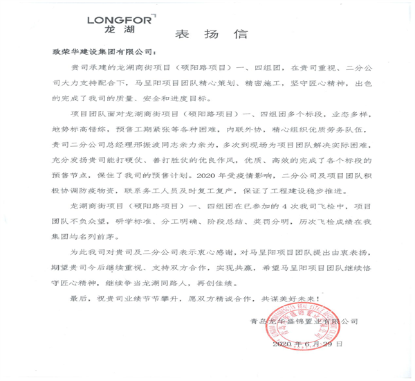 2020年6月29日,青島龍華盛錦置業(yè)公司發(fā)來(lái)表?yè)P(yáng)信,對(duì)二公司馬呈陽(yáng)項(xiàng)目部承建龍湖商街項(xiàng)目(碩陽(yáng)路項(xiàng)目)提出了表?yè)P(yáng)。