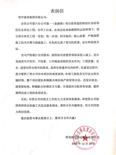 近期,集團(tuán)總部收到青島海信博遠(yuǎn)置業(yè)有限公司發(fā)來的表揚(yáng)信,對(duì)六公司第一(欒淵博)項(xiàng)目部施工的海信紅島府高層區(qū)總承包工程提出表揚(yáng)。
