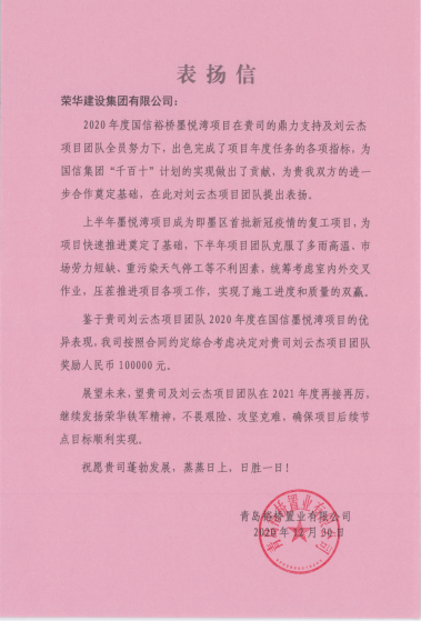 近日,集團(tuán)公司總部收到青島裕橋置業(yè)有限公司發(fā)來的表揚(yáng)信,對(duì)五公司第二十七(劉云杰)項(xiàng)目部施工的國信裕橋墨悅灣項(xiàng)目提出表揚(yáng)。