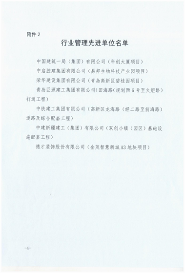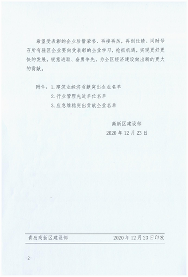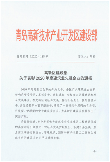 近期,青島高新區(qū)建設(shè)部發(fā)布《關(guān)于關(guān)于表彰2020年度建筑業(yè)先進(jìn)企業(yè)的通報(bào)》,三公司第十六(王慎平)項(xiàng)目部施工的青島高新區(qū)碧桂園項(xiàng)目綜合管理水平優(yōu)異,為集團(tuán)公司贏得“行業(yè)管理先進(jìn)單位”稱(chēng)號(hào),并對(duì)集團(tuán)公司在重大活動(dòng)、應(yīng)急保障、清欠維穩(wěn)方面做出的突出貢獻(xiàn)進(jìn)行表彰。