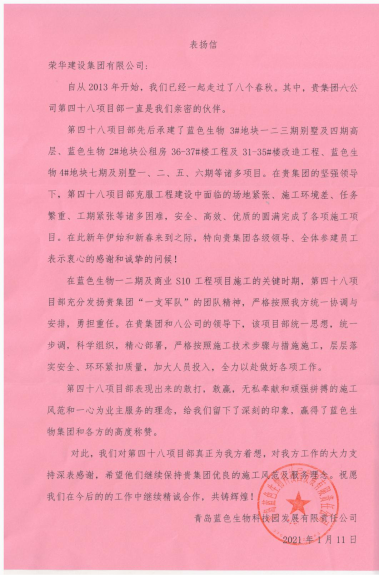 近日,集團(tuán)總部收到青島藍(lán)色生物科技園發(fā)展有限責(zé)任公司發(fā)來的表揚(yáng)信,對八公司第四十八(郝中華)項目部施工的藍(lán)色生物3#地塊一二三期別墅及四期高層、藍(lán)色生物2#地塊公租房36-37#樓工程及31-35#樓改造工程、藍(lán)色生物4#地塊7期及別墅一、二、五、六期等諸多項目提出表揚(yáng)。