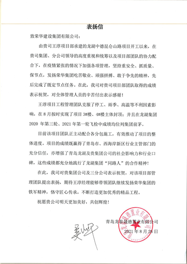 近期,集團總部收到青島龍?zhí)╆傻轮脴I(yè)有限公司發(fā)來的表揚信,對三公司王淳項目部施工的龍湖中德昆侖山路項目提出表揚。