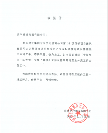 近日,集團(tuán)公司收到濟(jì)南明茂置業(yè)有限公司發(fā)來(lái)的表?yè)P(yáng)信,對(duì)濟(jì)南公司第三十八項(xiàng)目部施工的大宗能源商品總部項(xiàng)目產(chǎn)業(yè)園配套住宅項(xiàng)目售樓處項(xiàng)目提出表?yè)P(yáng)。
