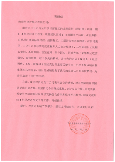 近日,集團(tuán)公司收到青島龍華盛錦置業(yè)有限公司發(fā)來的表揚(yáng)信,對(duì)二公司馬呈陽項(xiàng)目部施工的龍湖商街(碩陽路)一期1、4組團(tuán)項(xiàng)目提出表揚(yáng)。