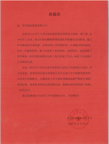 六公司第十九(宋鵬翔)項目部受到 青島海誠置業(yè)有限公司表揚